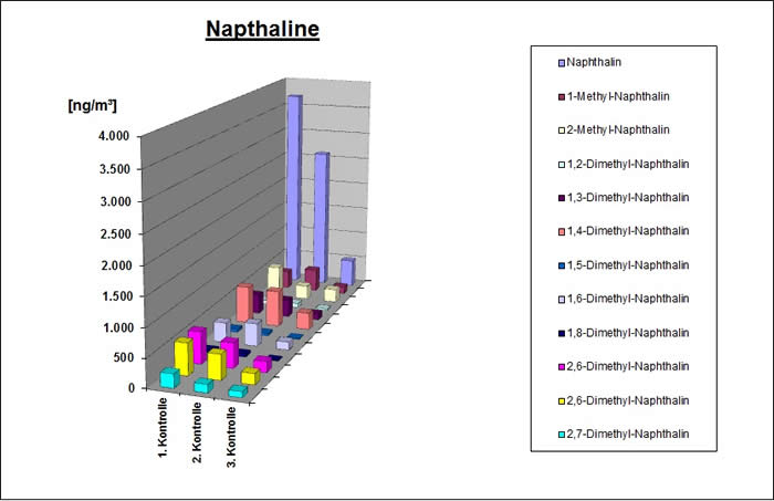 Der Innenraumrichtwert stellt einen Summenwert für die Gesamtgruppe Naphthalin, Naphthalin-ähnlicher Verbindungen sowie bi- und trizyklische aromatische Kohenwasserstoffe dar. Hierzu zählen u.a. mono- und dimethylierte Naphthaline, Acenaphthen, Acenaphthylen, Anthracen, Fluoren und Phenanthren.