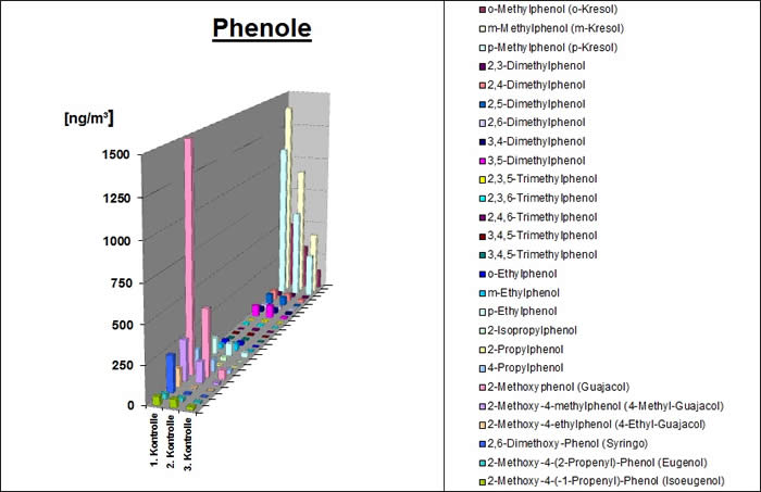 Unser Vorschlag für das Untersuchungsprogramm zur Sanierungskontrolle bei Brandschäden (nach Austausch von Materialien und einer Reinigung der Raumoberflächen) umfasst daher folgende Phenole und Naphthaline als Leitsubstanzen:
